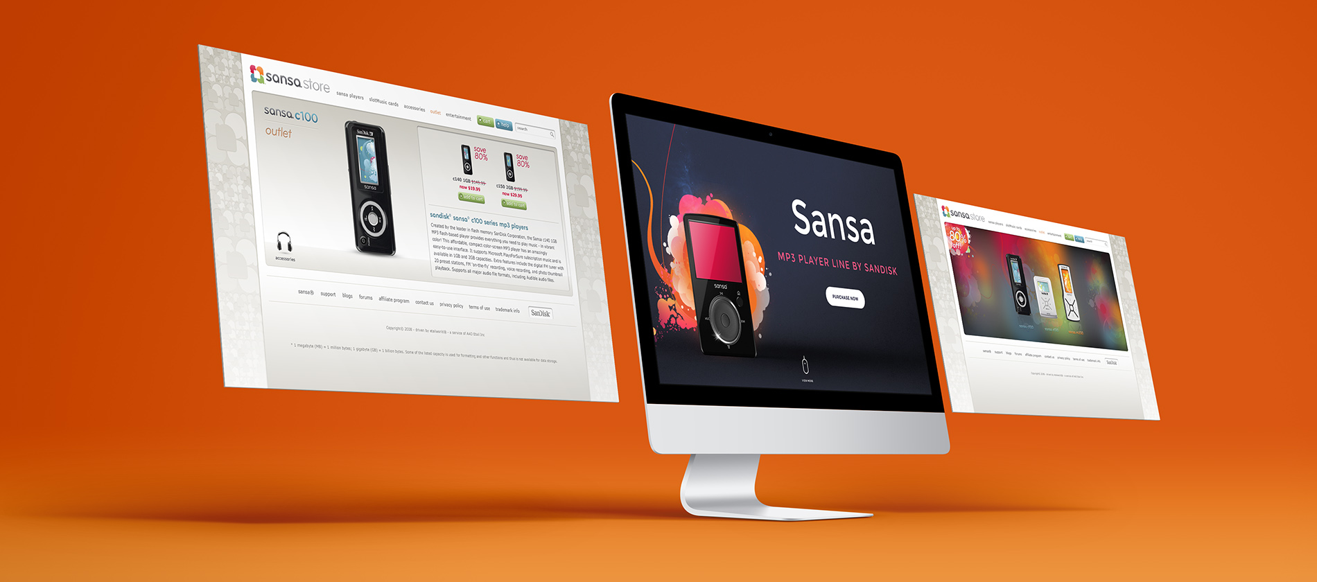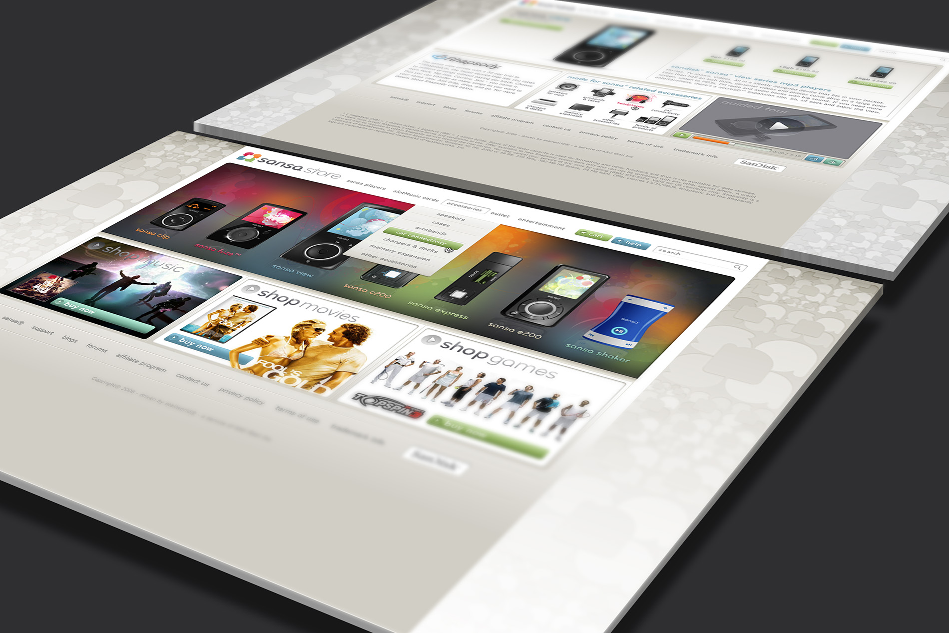 Corporate online store website for sansa MP3 player line by Sandisk. Role: Web Design, Graphic Design, Art Direction. Creative Director: Mike Rodda